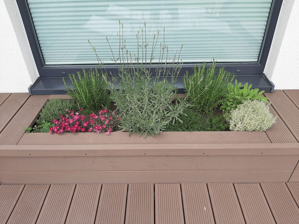 Na działce mieliśmy uwzględnić także miejsce na grill i ławę do siedzenia. Po prawej stronie od tarasu znajduje się wysoki mur oddzielający działkę od sąsiada, posłużył jako osłonięcie kącika do grillowania, a na tarasie pod oknem zbudowaliśmy ławę połączoną z donicą na zioła, po które można sięgać podczas szykowania posiłku i usiąść przy nich chłonąc olejki eteryczne i ciepło oddawane z nagrzanej słońcem elewacji.