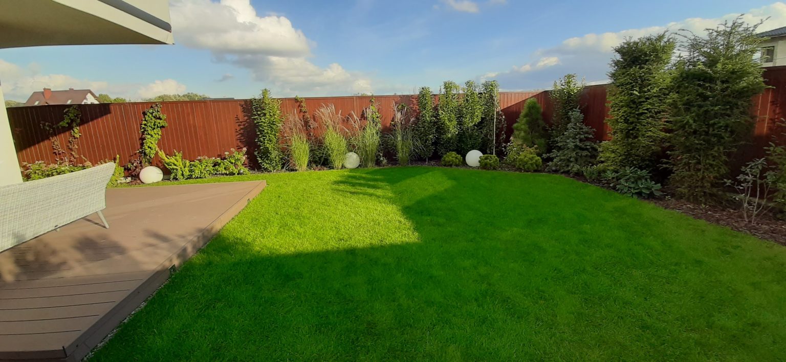 Trawnik miał stanowić większość terenu i być centrum ogródka, otoczony kolorowymi drzewami i krzewami. Właściciele chcieli, żeby zieleń była łatwa w utrzymaniu i jednocześnie osłaniała widok od sąsiadów. Zamówiliśmy duże sadzonki roślin, aby efekt był widoczny od razu. Dodatkową osłonę tworzą drewniane panele, malowane na ciepły, brązowy kolor.