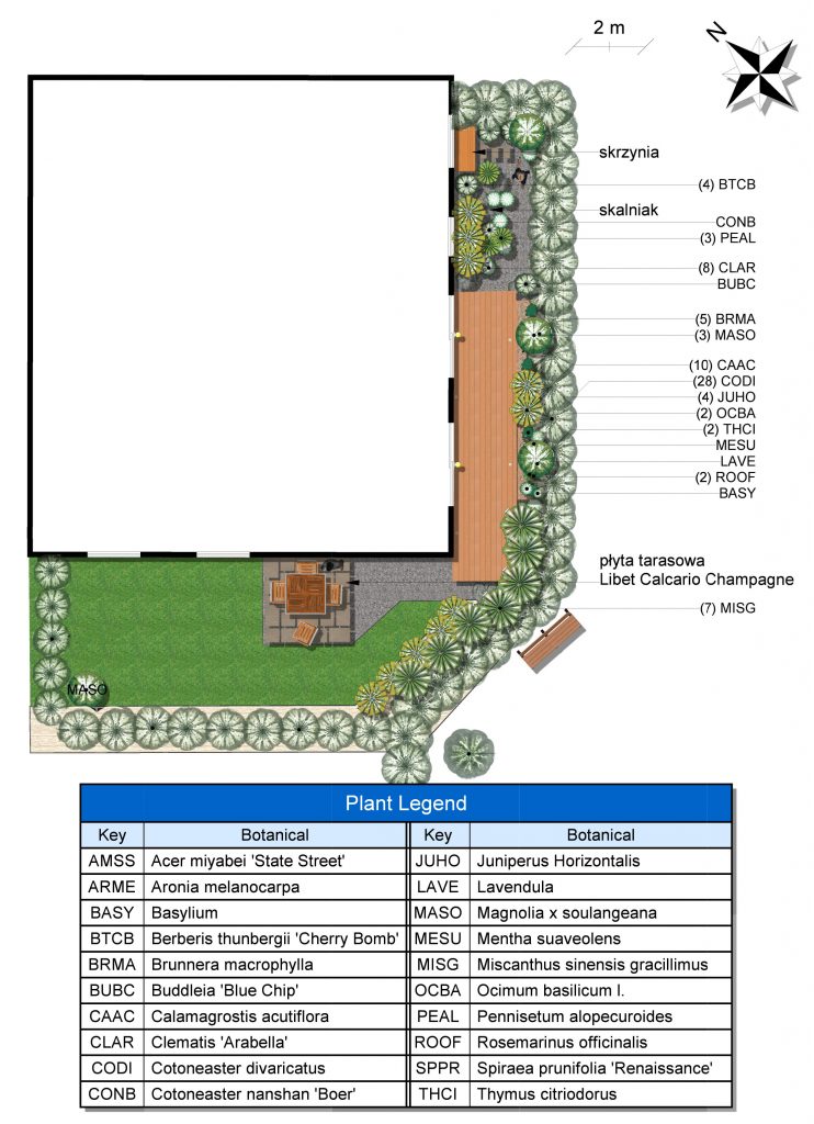 Na osiedlu nie można sadzić gatunków roślin inwazyjnych, silnie pylących i uczulających. Zabronione jest także stosowanie roślin iglastych o pokrojach stożkowych lub kolumnowych, inne iglaki mogą dorastać do maksymalnej wysokości ok. 1,3m ze względu na uzbrojenie terenu. Całość ogrodu zlokalizowana jest na płycie parkingowej, na której warstwa gleby stanowi ok 70 cm. Lokalizacja i dobór gatunkowy nowo sadzonych drzew powinien być uzgodniony z sąsiadami. Wysokość krzewów liściastych też jest ograniczona do 2m. Dobór roślin w ogrodzie powinien być spójny z osiedlowymi nasadzeniami. Mogliśmy zasadzić niezbyt wysokie trawy ozdobne. Na osiedlu rosną powojniki, trawy ozdobne, budleje i berberysy.