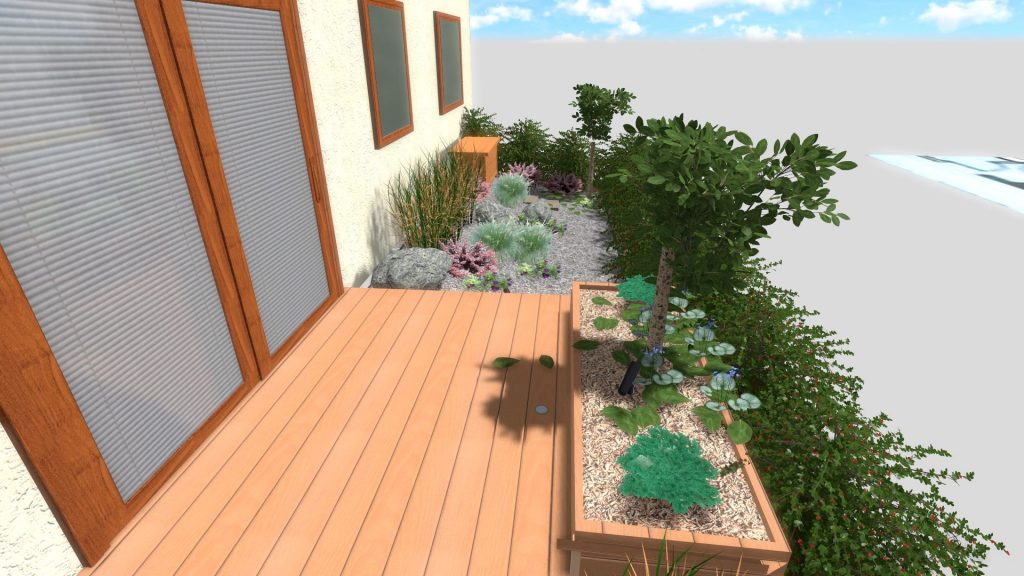 Taras znajduje się w południowej wystawie oraz osłonięty jest przez balkon od naturalnych opadów. Po lewej jego stronie znajduje się skarpa. Klienci chcieli tutaj założyć skalniak. Posadziliśmy zatem wrzosy, jałowce, irgi, sukulenty i trawy ozdobne. W tyle także mieliśmy uwzględnić miejsce dla skrzyni na poduchy.